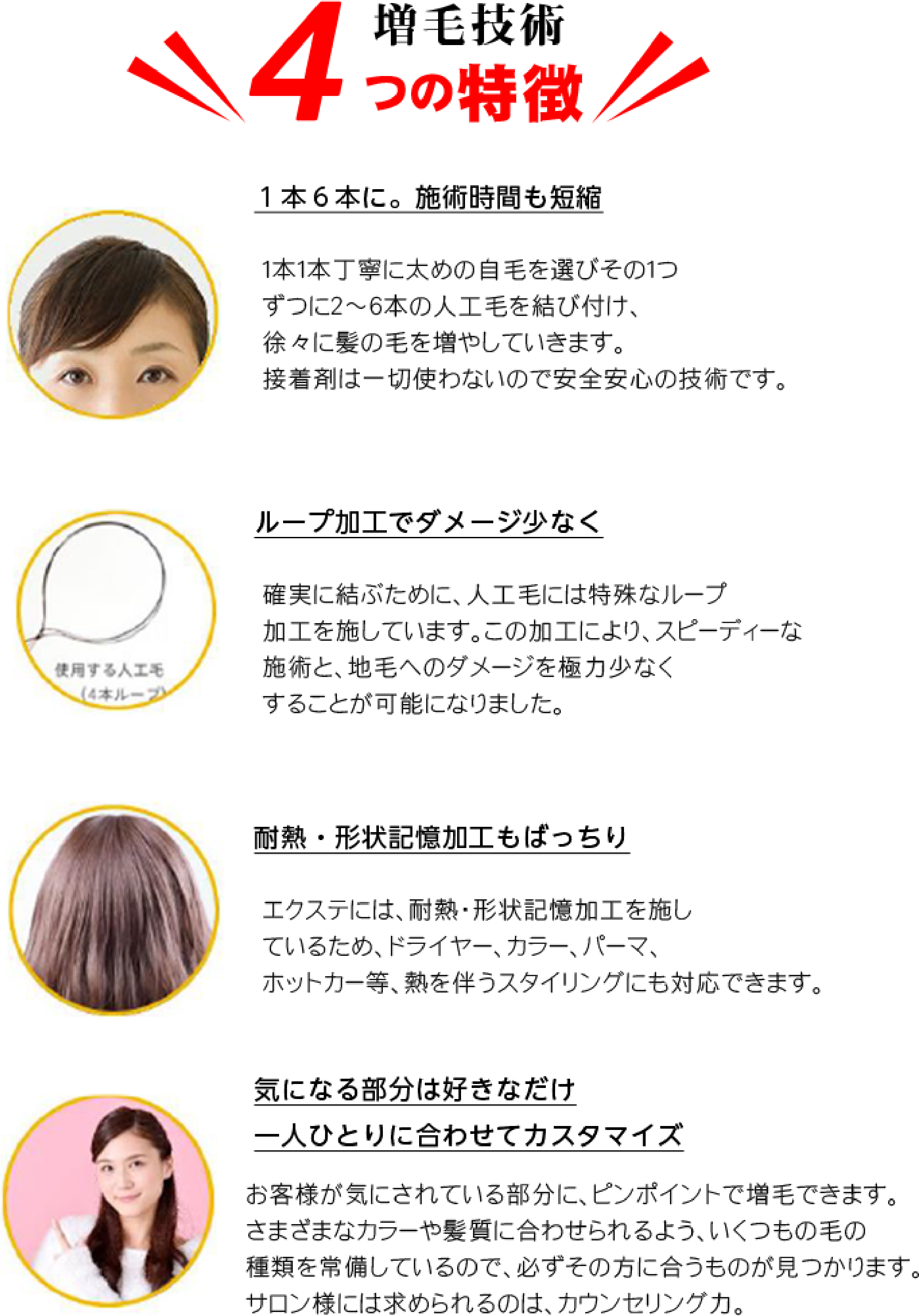 日本増毛スクールが開発した、他社とは一線を画す「増毛エクステ」の特徴を以下に示します。